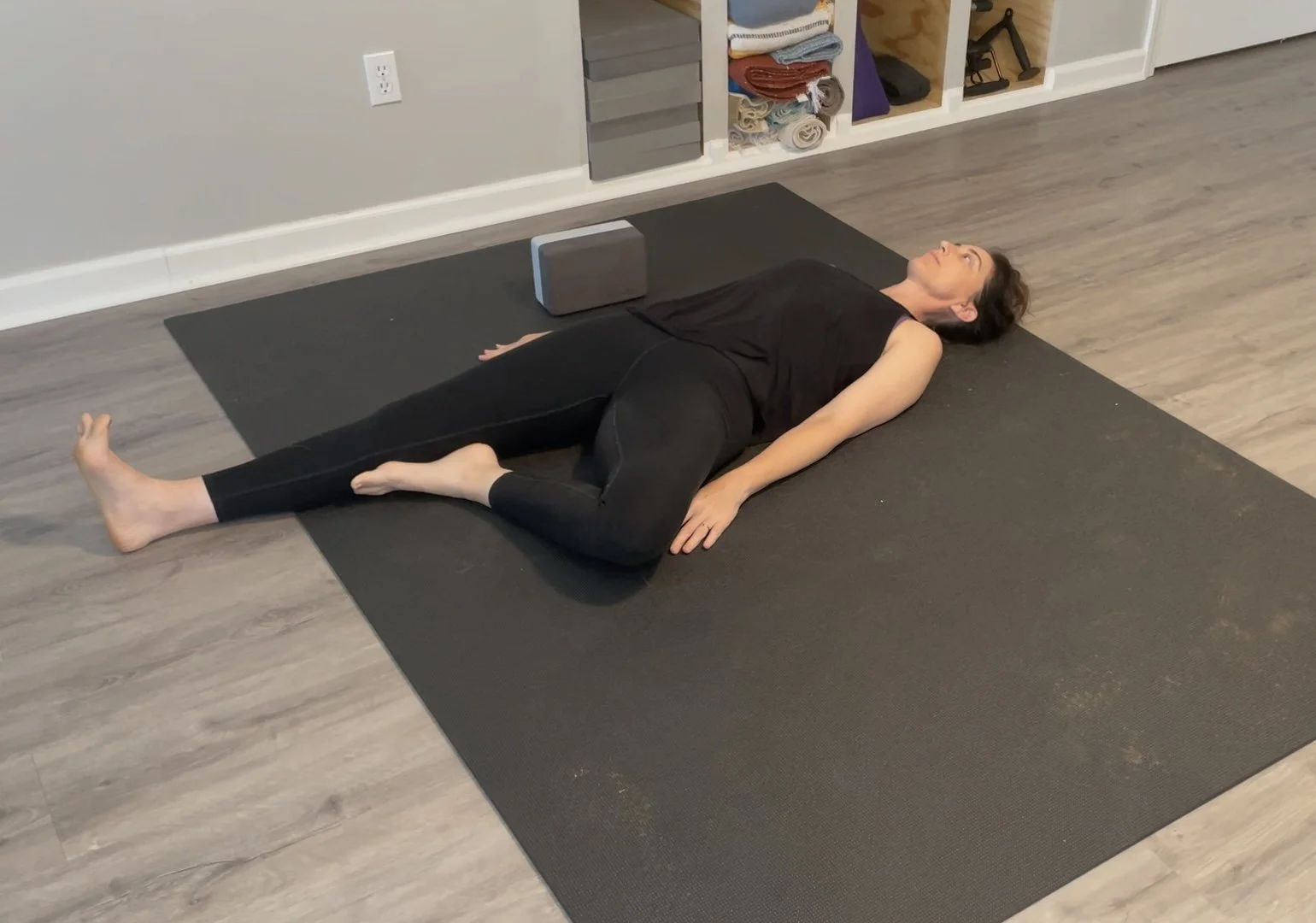 Lay on your back. Find your neutral pelvic position. Engage your abdomen. Bring your foot next to your opposite knee and turn the leg out. Use a prop to support if uncomfortable to do without.